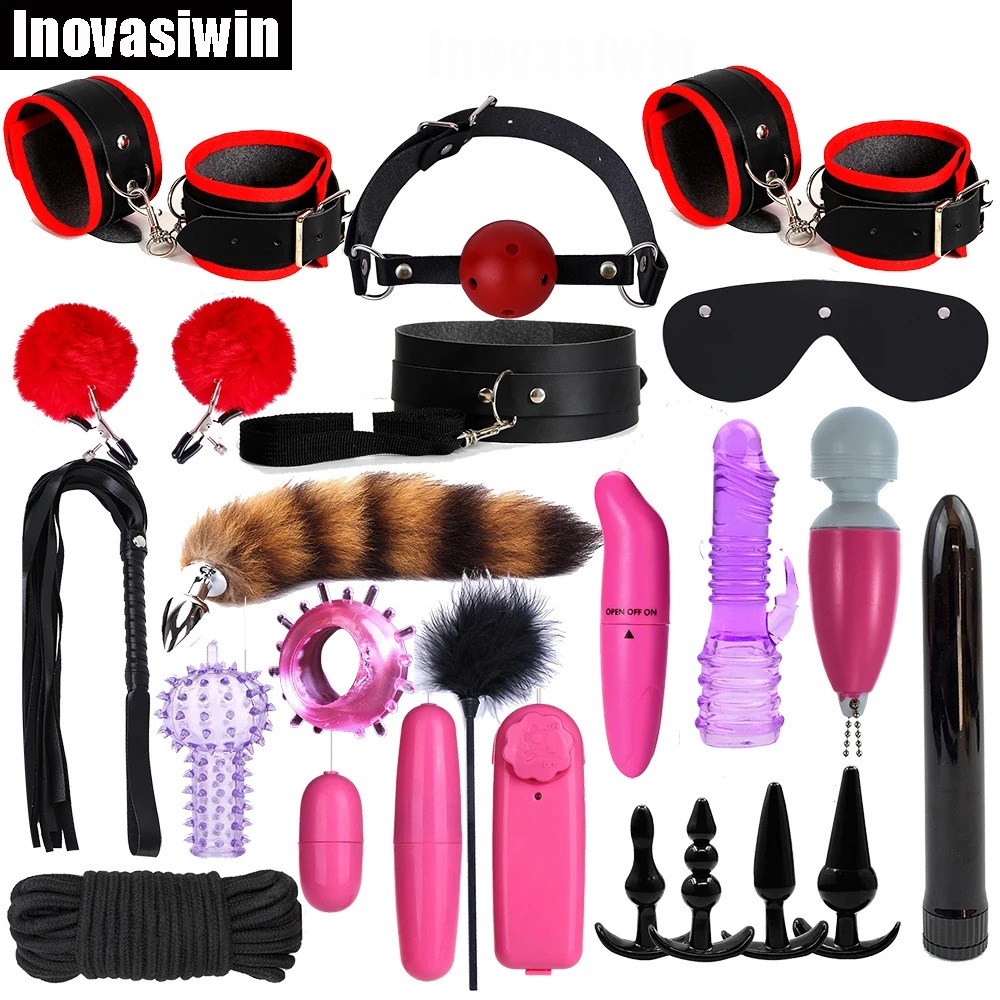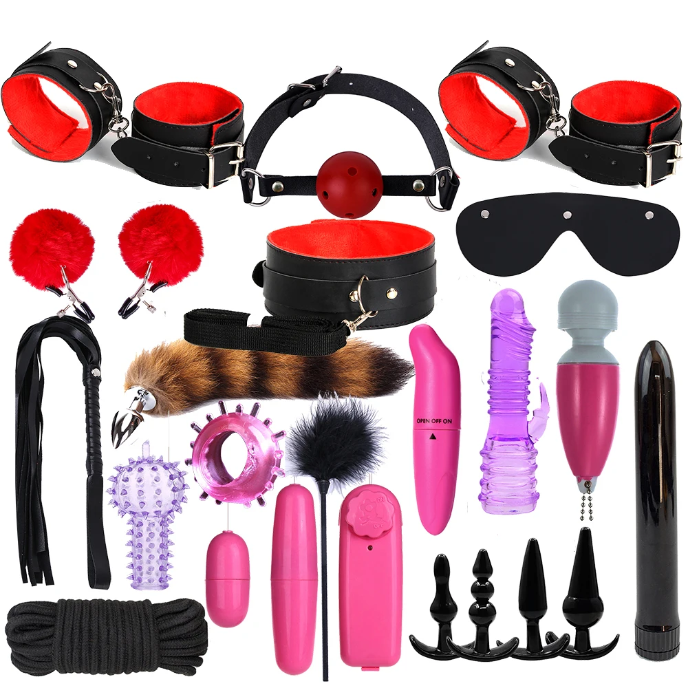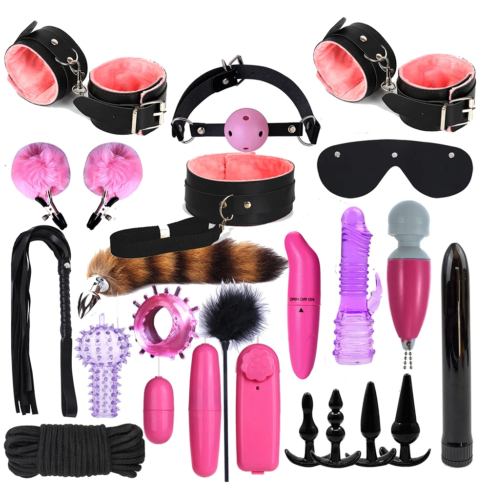 24pcs BDSM Set sex bondage set slave collar dog collar tail anal plug handcuffs Jumping fun egg vibrator silicon dildo for woman : Click here